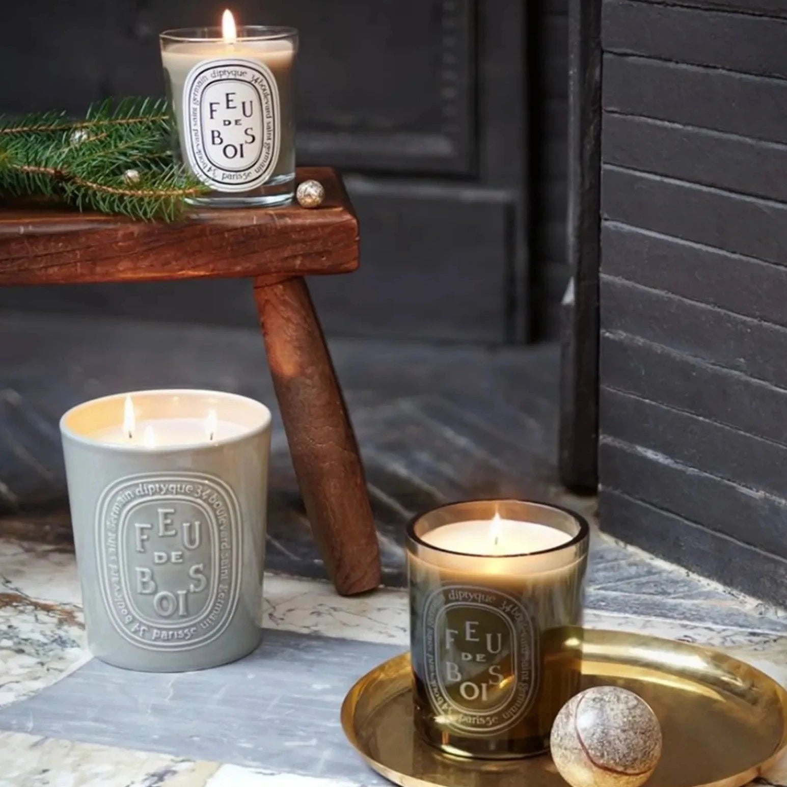 The Diptyque Feu De Bois Scented Candle smells like a warm, crackling wood fire.