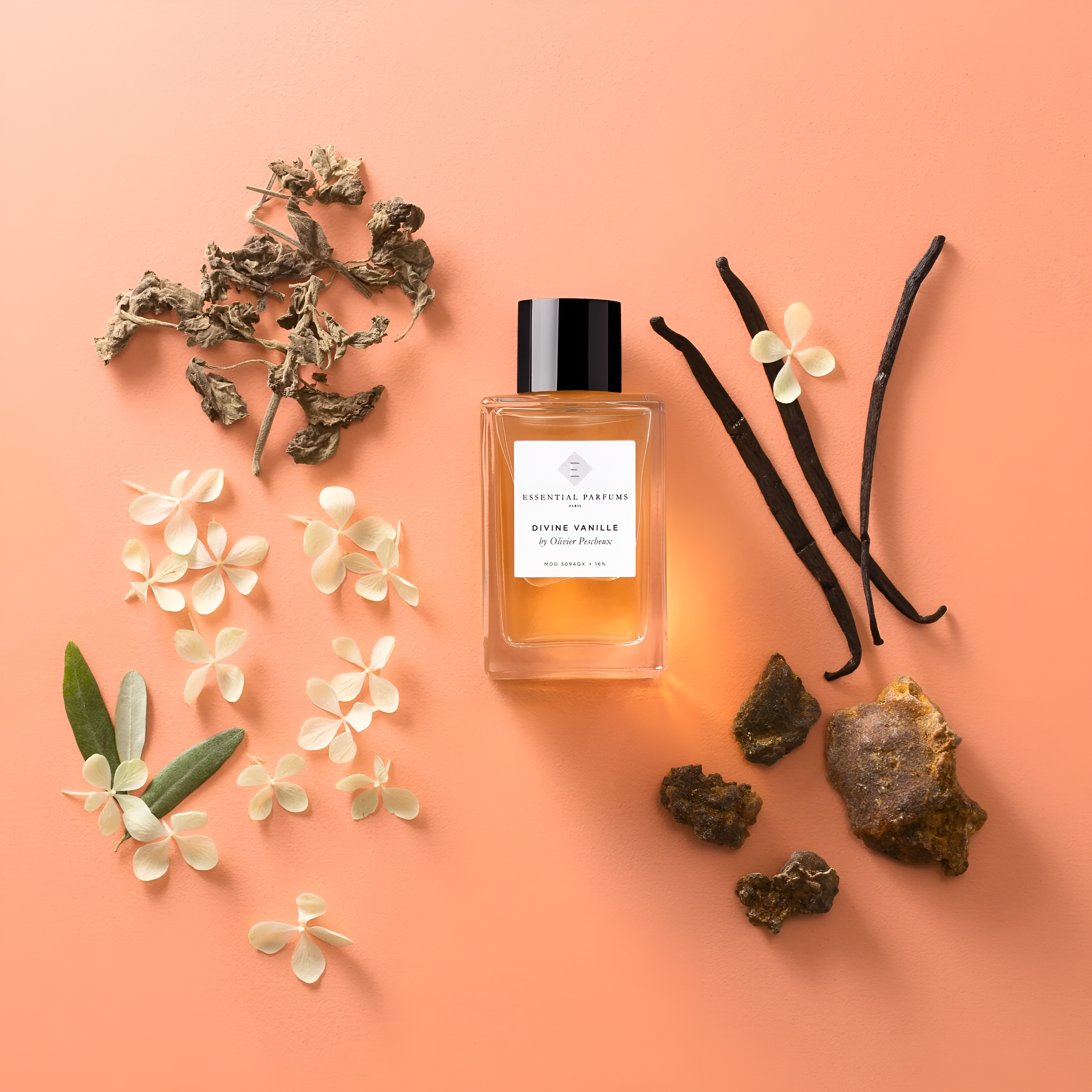 Essential Parfums Divine Vanille EDP smells like warm, rich vanilla from Madagascar with hints of creamy cedarwood, earthy patchouli, and soft musks, accented by spicy, powdery mimosa and vetiver.