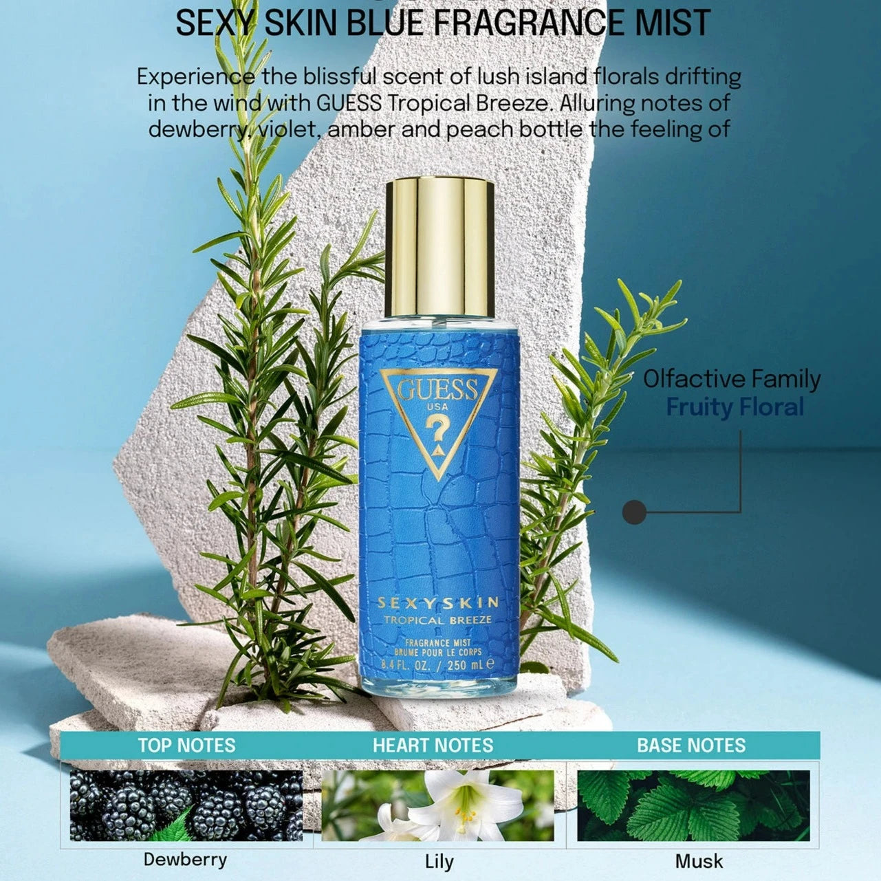 Guess Sexy Skin Tropical Breeze Body Mist smells like a fruity floral escape, with lush island flowers, sweet pineapple, and warm amber notes.