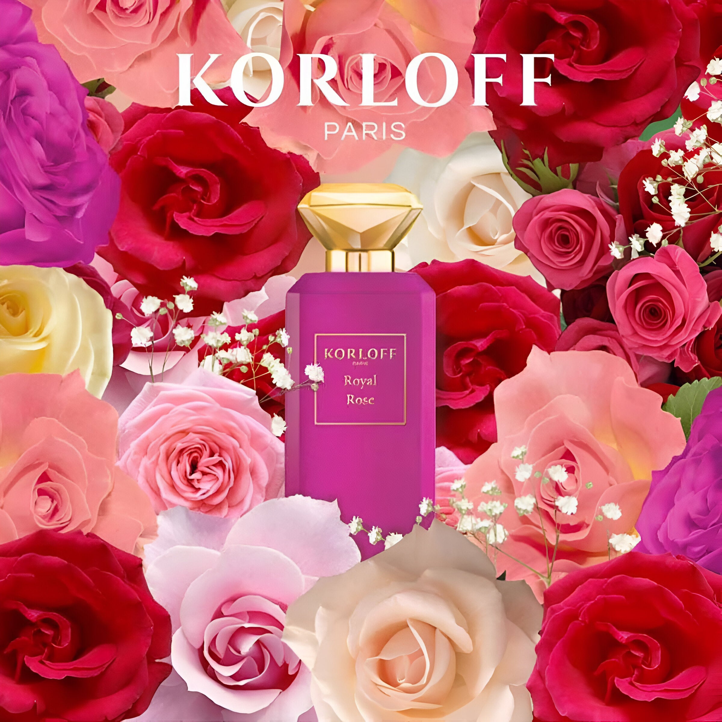 Korloff Paris Royal Rose EDP smells like a luxurious bouquet of roses with a hint of spice, capturing the essence of Parisian romance and timeless elegance.