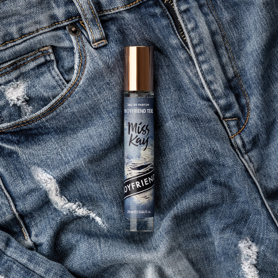 Miss Kay Boyfriend Tee EDP smells like a warm, sweet blend of leather and floral notes with a refreshing beachy twist, perfect for those dreamy summer days and festival vibes.