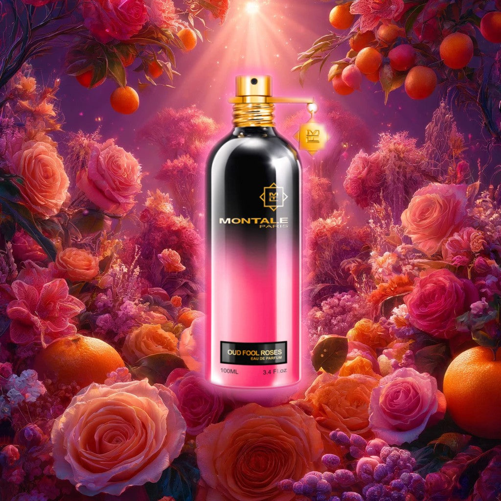 Montale Oud Fool Roses EDP smells like a rich and enchanting blend of fresh tangerine, luxurious roses, warm oud, and soft cashmere wood, creating a captivating and mysterious scent for both men and women.
