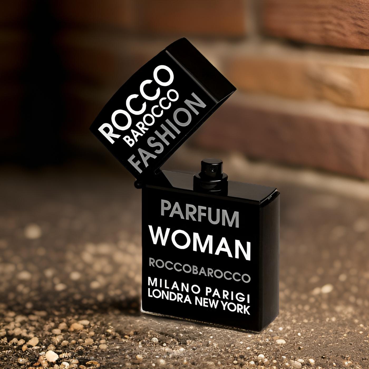 Roccobarocco Fashion Woman EDP smells like a captivating blend of delicate florals and fruity accents, enriched with warm, woody resins for a lasting and sophisticated aroma.