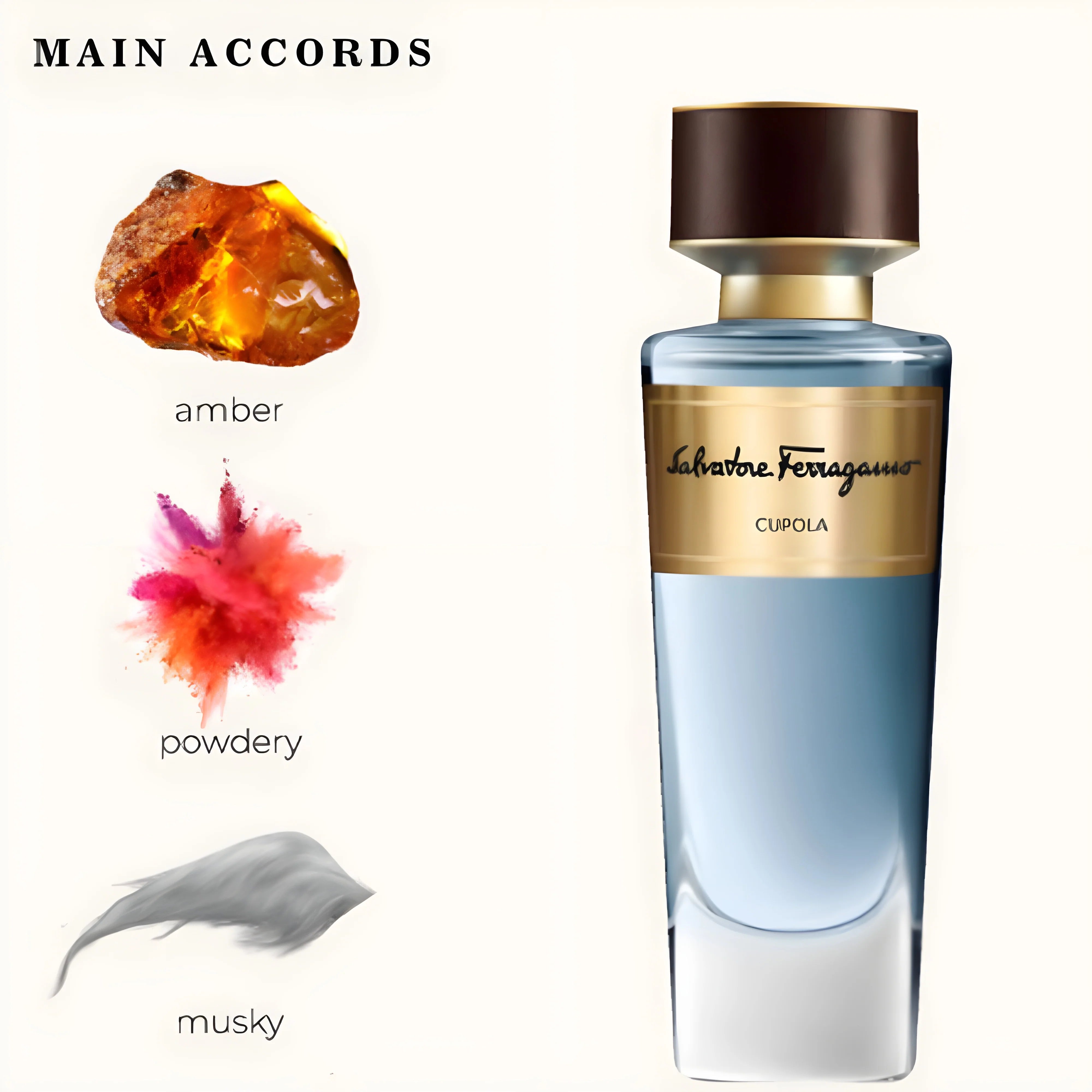 Cupola smells like a clean, slightly spicy and powdery iris blended with warm balsams and dry ambery woods (a hint of tangerine and leathery saffron/angelica), giving a smooth, unisex, slightly somber but long-lasting scent.